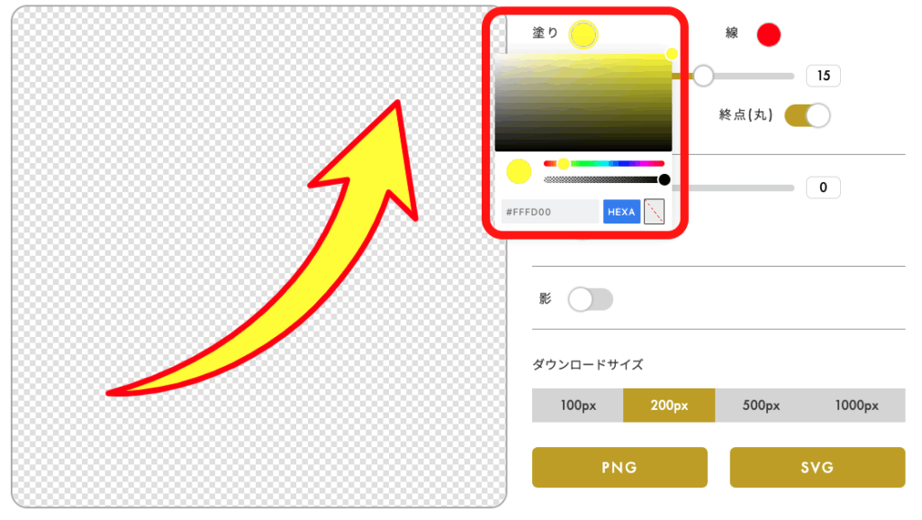 「塗り」と同様にカラーピッカーまたはカラーコードで色を指定します。
