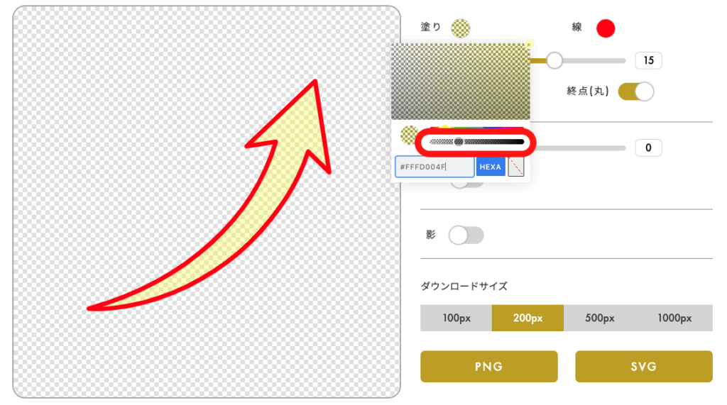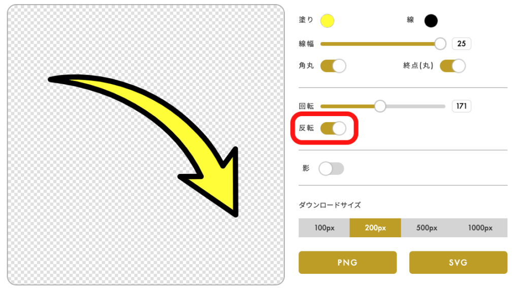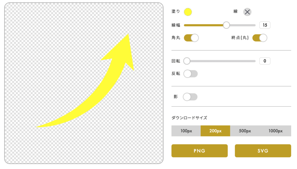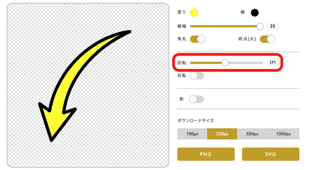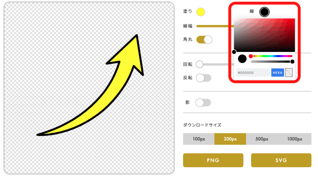 その矢印素材は色をカスタマイズしたり、角度や線の太さを変更することが可能です。