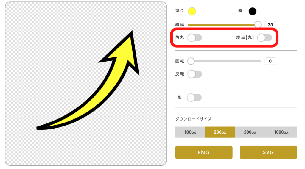 角丸、終点(丸)のトグルボタンを無効にすることで、尖った矢印にすることができます。
