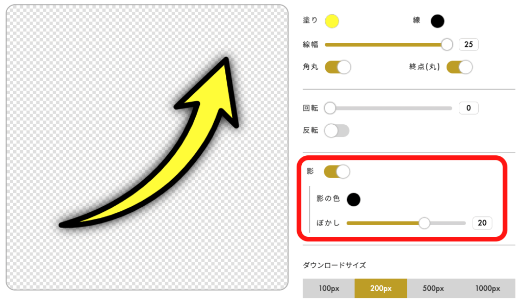 矢印の「影」を付けるか付けないか、影の色とぼかし具合を指定できます。